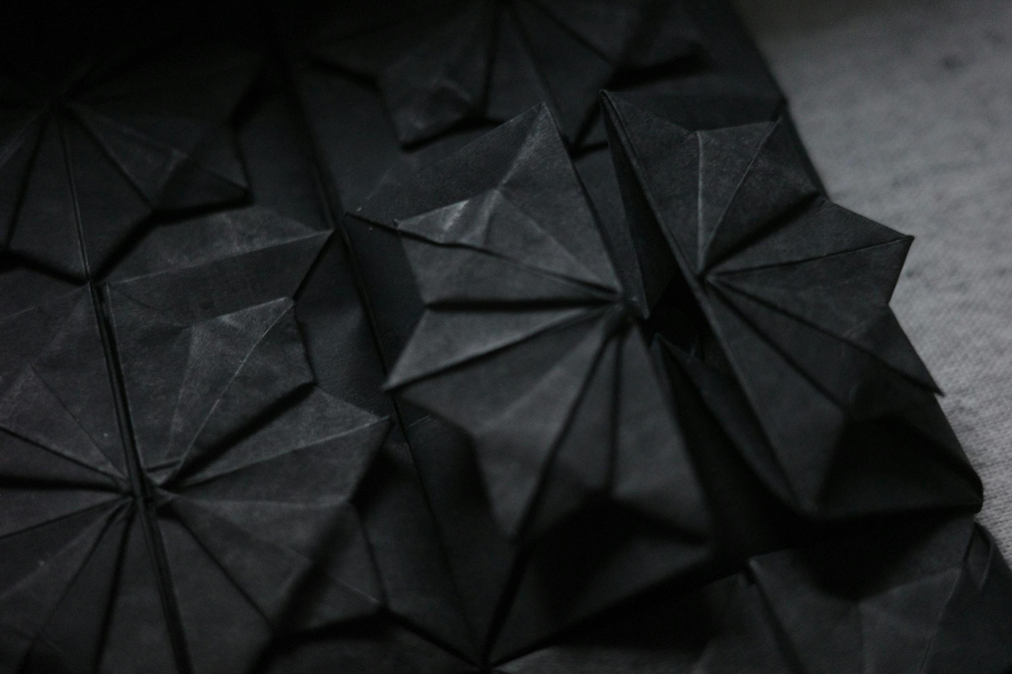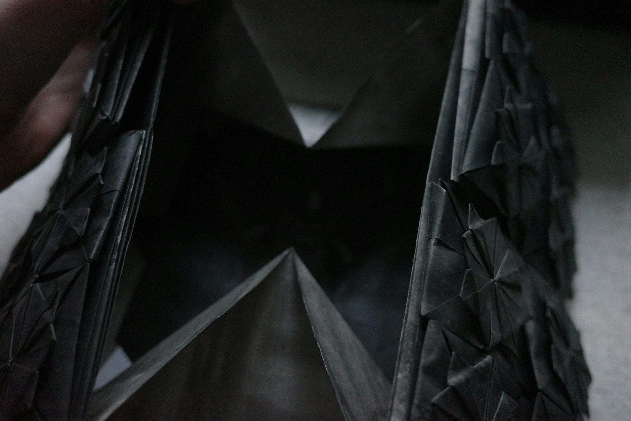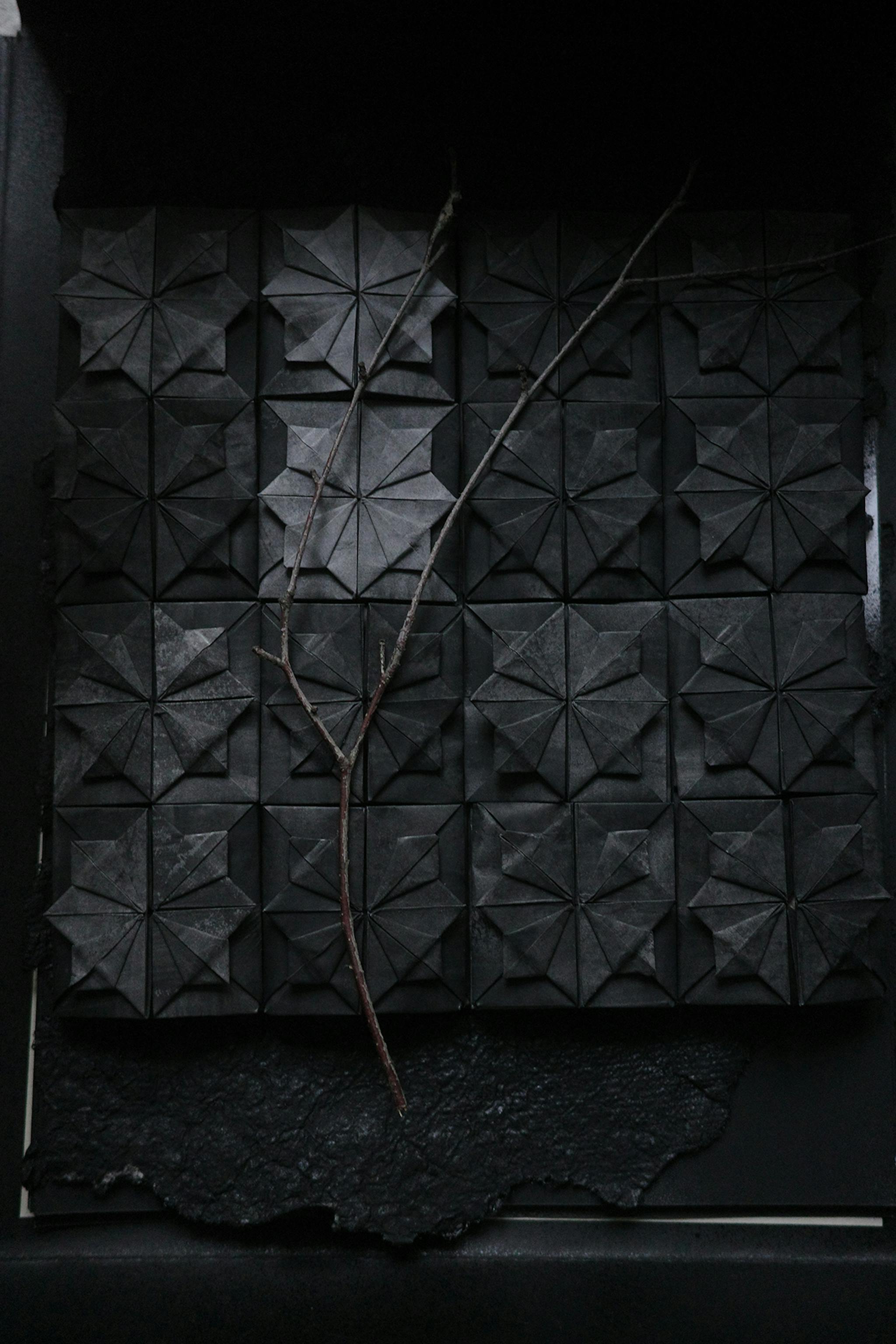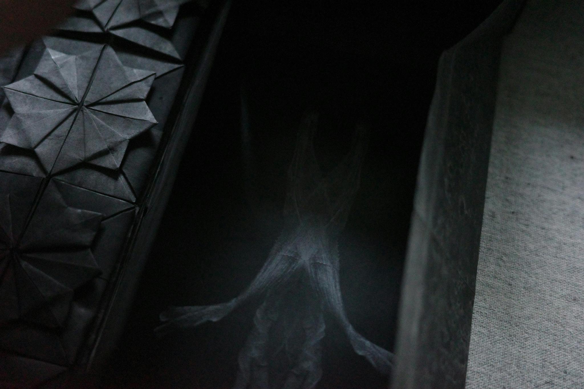 An origami book made of handmade paper painted with ink. The cover features a branch of a hundred-year-old birch tree — the key to the book's space. Inside are modules of various sizes, ending with a warrior mask, a symbol of the transition from fragment to whole.