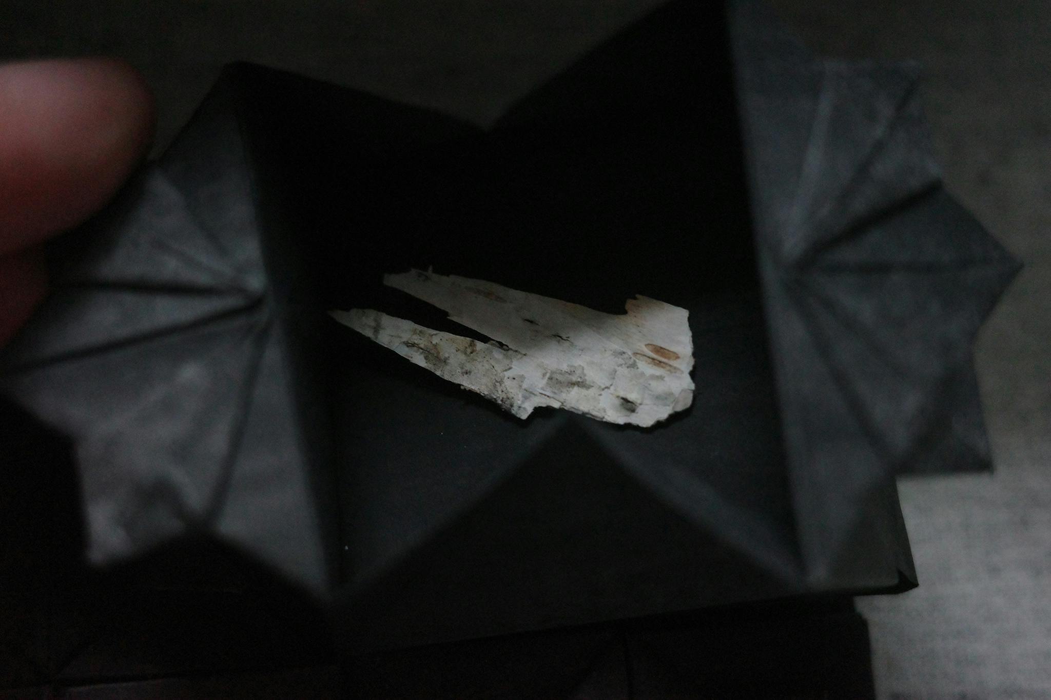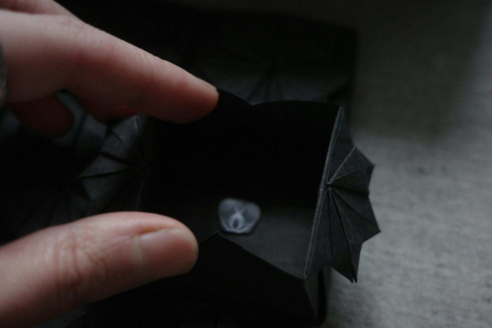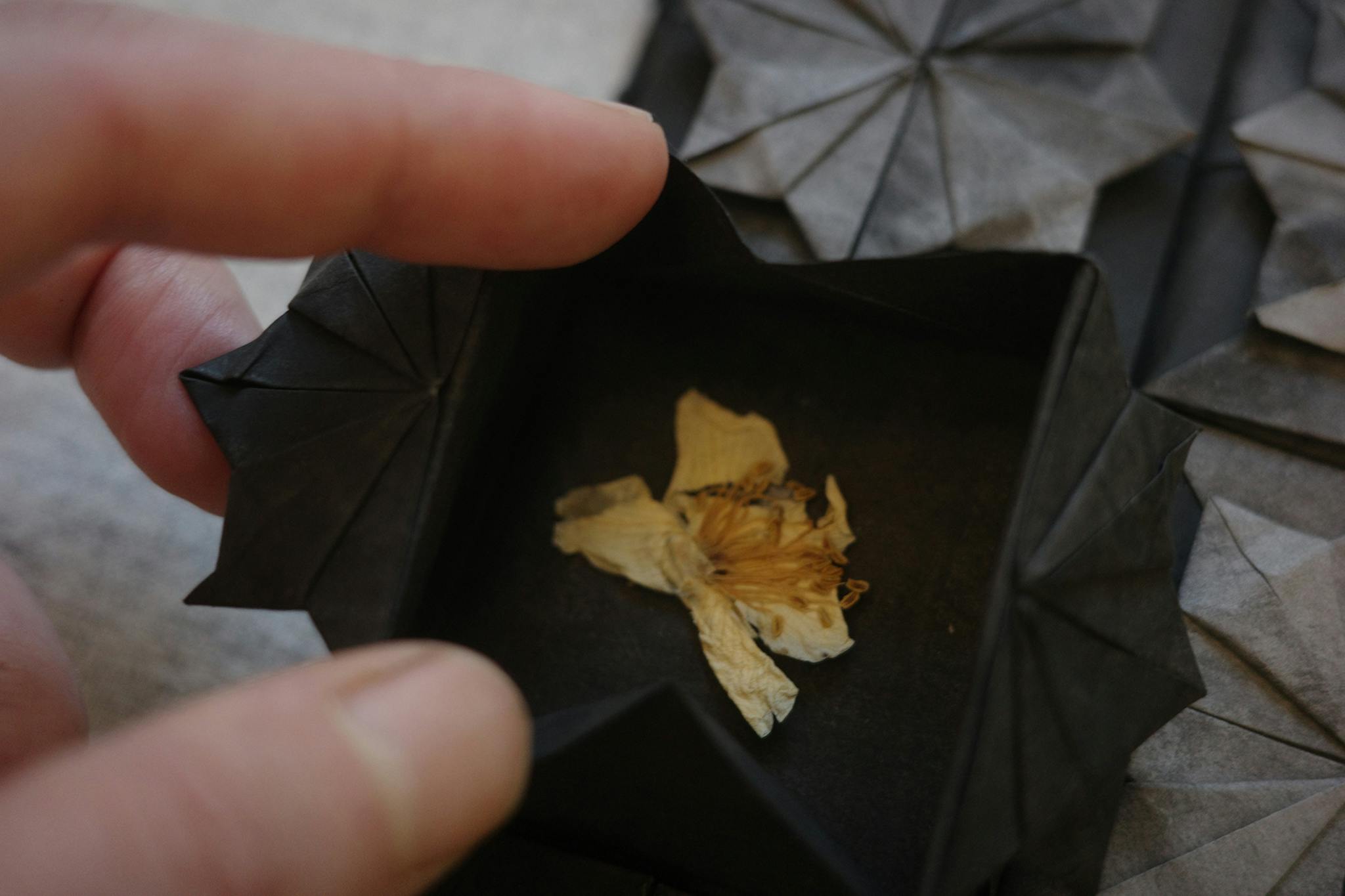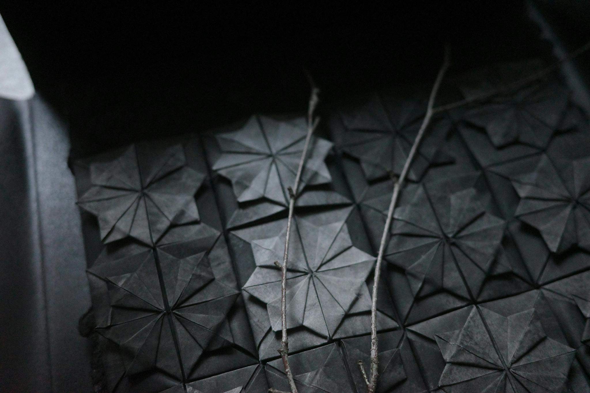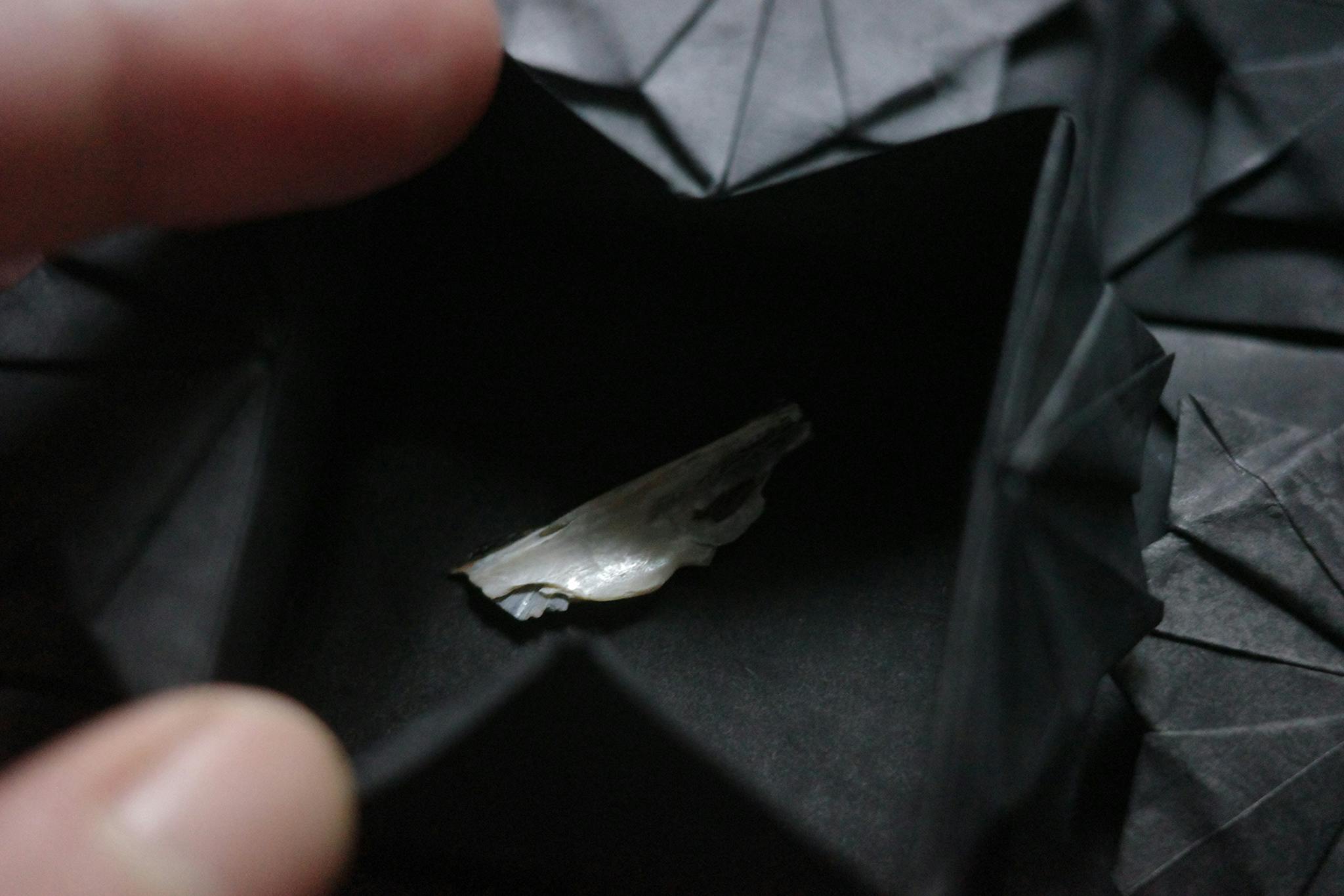 An origami book made of handmade paper painted with ink. The cover features a branch of a hundred-year-old birch tree — the key to the book's space. Inside are modules of various sizes, ending with a warrior mask, a symbol of the transition from fragment to whole.